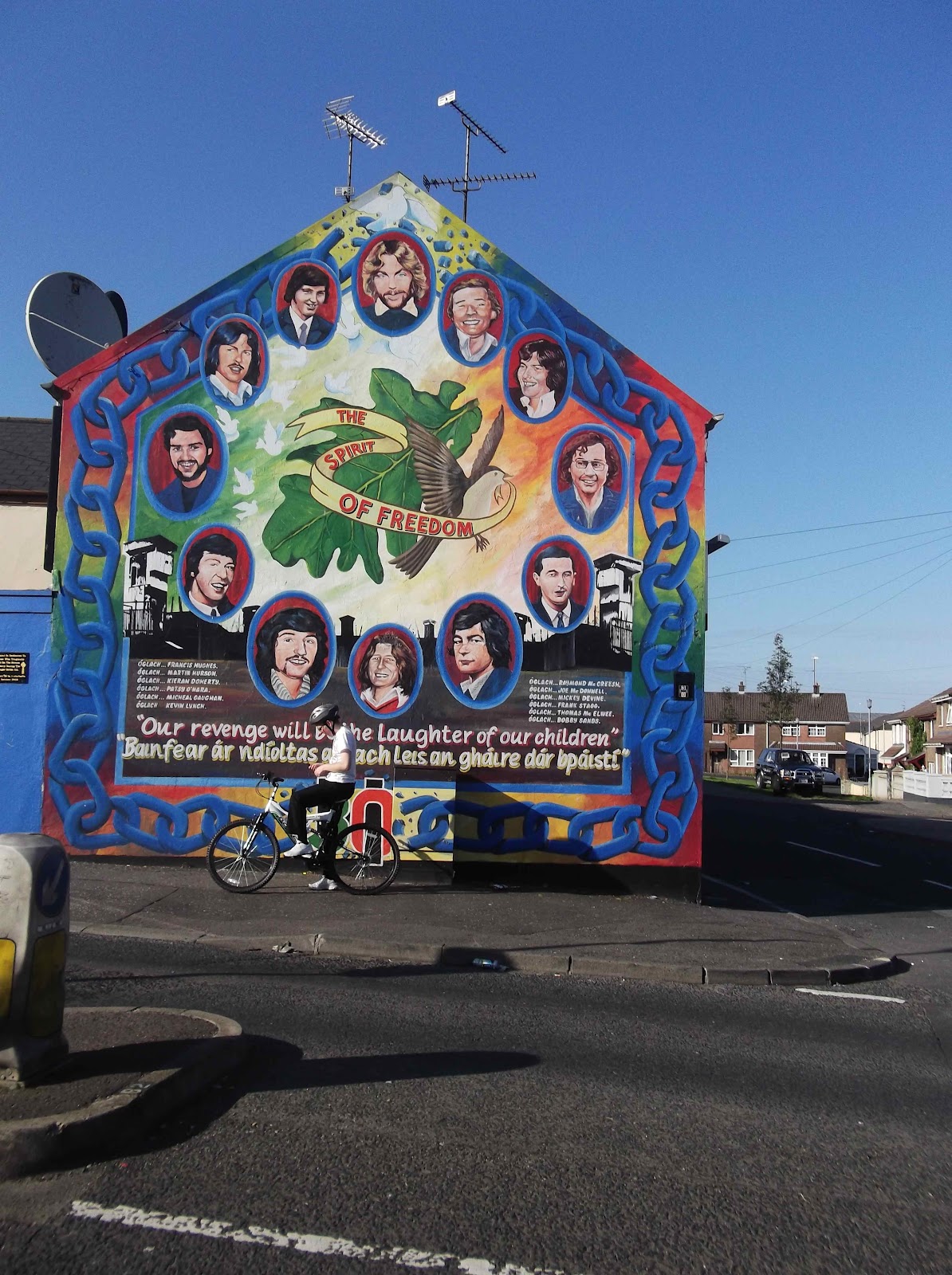 We took a car ferry across the Foyle mouth to County Donegal and found ourselves near the northern tip of Ireland which is actually in Southern Ireland (?). We had a big dinner, as we had skipped lunch, in Leo's Cafe south of Derry, which seemed to be the cheapest cafe in the country. We drove around Derry again and spotted this mural:
